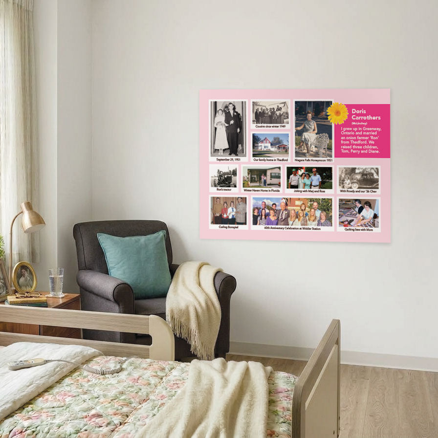 Printed large for a resident’s room, our collages give care teams insights about a person's life and inner spirit.